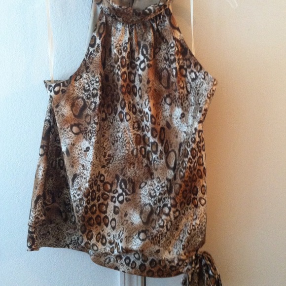 Only worn once. I love this blouse but its to big for me now. Very classy for work under a brown suit or sexy for a night out with a brown leather mini and heels.