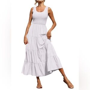 Elevate your summer wardrobe with our Sleeveless Maxi Dress, featuring a tiered and smocked design for effortless style and comfort. This long summer dress is perfect for casual occasions, with wide shoulder straps and a sleeveless silhouette crafted from 100% polyester fabric.