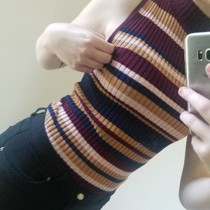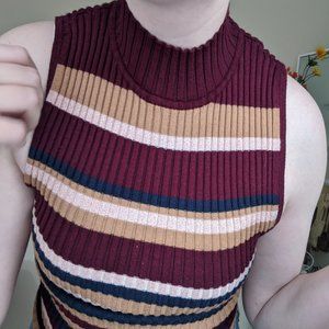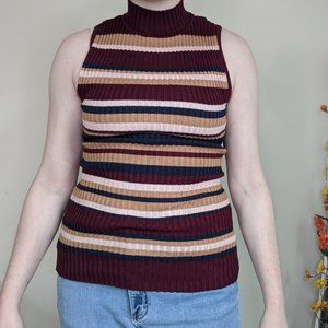 Hooked Up brand sleeveless mock neck ribbed top with striped pattern. The light pink stripes have shimmery thread. Very cute and retro. Long enough to be tucked into pants, shorts, skirts, etc. Very comfy and soft. Great condition. Medium size but has great stretch so could fit large as well.