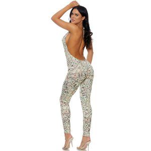 Sleeveless money print jumpsuit with plunging neckline, halter tie closure and sexy low cut back. Necklace sold separately, purchase together and save. Other accessories not included. Cream/Green money print. New in package. 90% Polyester/10% Spandex. Great for clubwear, dance or festival wear, or add accessories for Halloween costumes and cosplay!