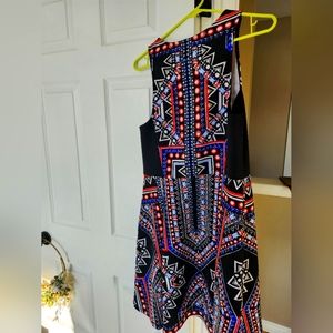 Very fun and vibrant Mossimo dress from Target. Zipper is in the front of the dress, making it a unique style than most. This is a large and made of polyester and spandex. Easily machine washable in cold water.