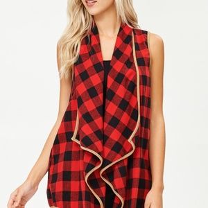Lapel,Draped open front, Plaid pattern, Front pockets, Brushed fabric exterior,Sleeveless cardigans with unique trim.