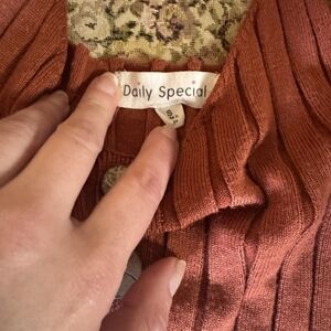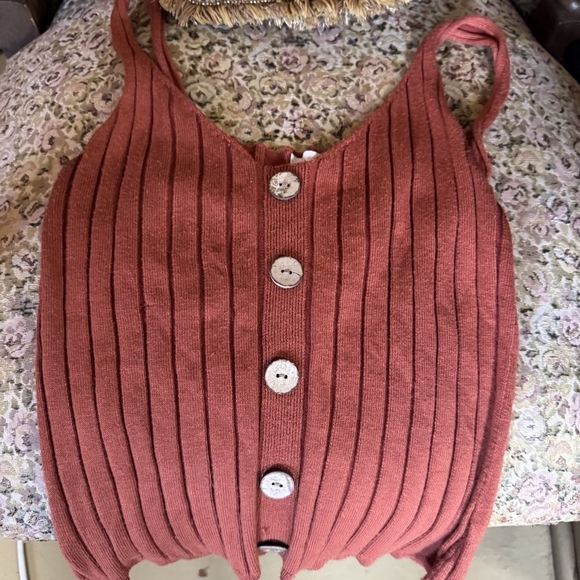 Soft ribbed sleeveless tank in a warm rust color. Features front button closures and slim shoulder straps for a fitted silhouette. Lightweight knit ideal for layering or wearing on its own. Easy-care fabric for everyday wear.