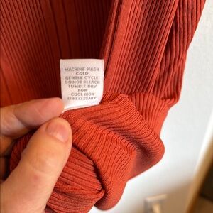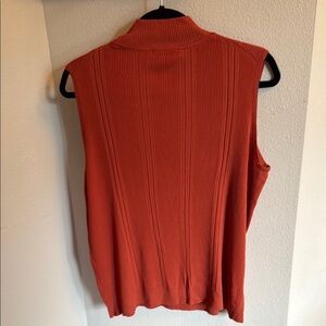 Elevate your wardrobe with this stylish sleeveless ribbed knit sweater. The rich rust color adds warmth and versatility to any outfit. Perfect for layering or wearing on its own. Has a mock turtleneck and machine washable too!