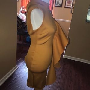 This dress is fitted with a zipper back. Mustard yellow with ruffle down left side. Only worn twice. Great for a night out with the girls!