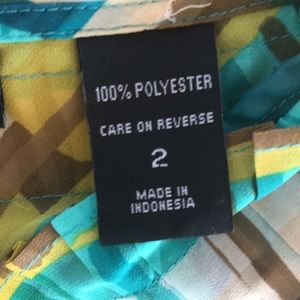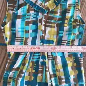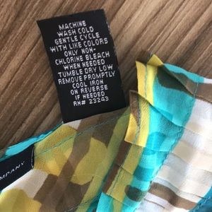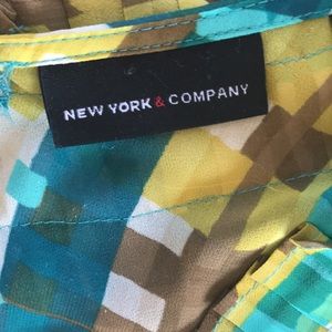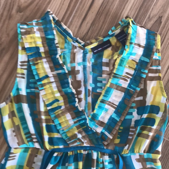 Teal, cyan, olive, asparagus, white. Pleated ruffles around a v-neck. Raised empire waist. Ribbon tie in the back. Sleeveless. Sheer fabric. Underarm side zipper. Size 2. NewYork & Company. Excellent used condition. No damage or flaws. See photos for measurements, fabric content, and care instructions.