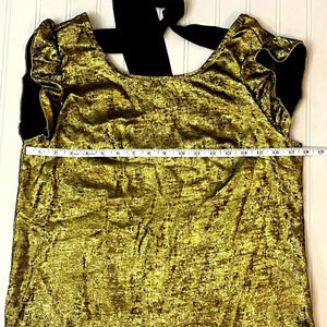 Gently used, excellent condition, Brand and Size tag are missing, based on measurements, it is closest to a Women's size Medium, festive metallic gold, lightweight, ruffle detail on sleeves/shoulder, black tie in back, would pair nice with pants or skirt, night out, party, please see pictures for approximate measurements, 100% polyester, machine wash or hand wash cold