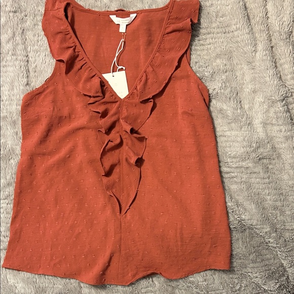 Charming dark mauve blouse with playful ruffles. Sleeveless design for versatile wear.