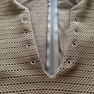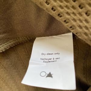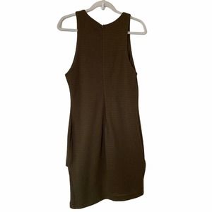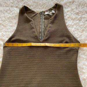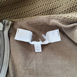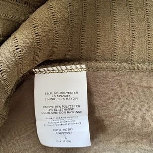 Sleeveless Sheath Dress. Military Green. Tulip hem. Grommet Detail. V-Neck. Midi. Size Large. Knit-type fabric with eyelet pattern. Zipper closure on back. Excellent pre-owned condition. No brand tag. Self: 96% polyester, 4% spandex. Lining: 100% rayon. Dry clean.