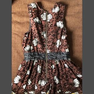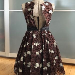 Truly unique dress with a silk shell in a warm brown with black flocking and luminous white painted water lillies. Black silk cummerbund-style waist band. Black polyester slip with crinoline to puff out the skirt.