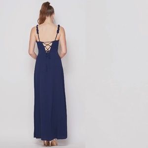 Designed By Teeze Me. This sleeveless solid maxi dress features a front slit skirt, adjustable bra straps, back zipper closure, and back lattice tie details.