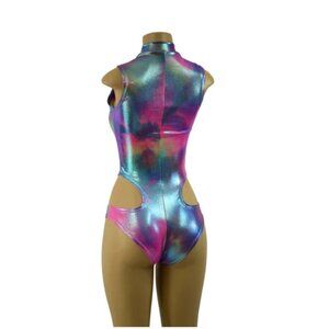 This bodysuit is made of four way stretch spandex in Cotton Candy Holographic.