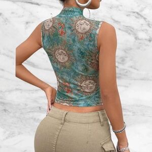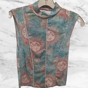 This sleeveless top features a captivating sun and moon print on a sheer mesh fabric, ideal for layering. The mock neck adds an elegant touch, while the versatile design suits various occasions.is in excellent condition it only does not have the size and the care instruction label from smoke and pet free home.C.0444