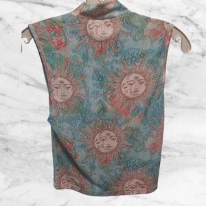 Sleeveless Sun & Moon Print Mock Neck Top size Small multi green color