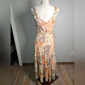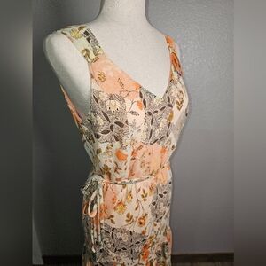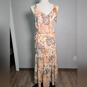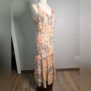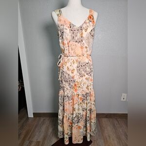 Sleeveless Tiered Floral Summer Tank Dress With Tie Peach And Brown Sz 12
