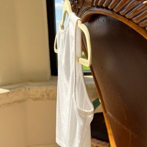 The shirt rests on her hips with a cute tied-knot in the front to gather the shirt.
