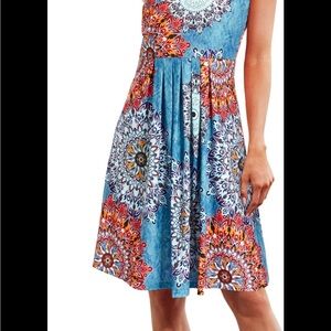 Women's sleeveless dress with a vibrant mandala print, often described as a bohemian summer dress or a casual loose beach sundress. This style is characterized by its relaxed fit, colorful patterns, and suitability for warm weather and casual occasions like beach outings or vacations. The dress has a comfortable, flowing silhouette, featuring a pleated skirt, v-neck and pockets for added functionality. Armpit to armpit measurement is 18 inches and length from shoulder to hem is 40 inches. This dress is NWOT