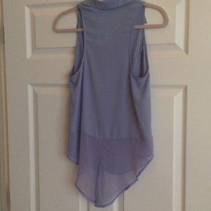Light blue button-up chiffon blouse with a gold embellishment on the collar. The shirt is lower in the back and has a sheer bottom.