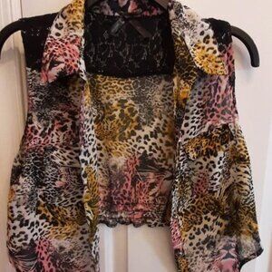 Sleeveless, button up, tie in front, pockets, black onyx buttons and lace blouse