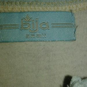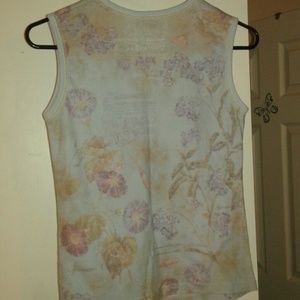 Sleeveless top with soft flowers on a light blue top. It has a little v cut out at the neck. Made by bija. Size s-m.