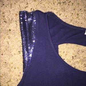 Sequins had a touch of fun to this soft, navy shirt. Sequins are just on the cap-sleeves. For an extra touch, the back has a cut-out that drapes. It pairs nicely with a maxi skirt or looks phenomenal with jeans. Great addition to anyone's closet. Easy to throw on and run out the door.
