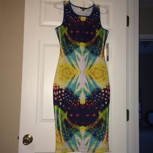 This is a beautiful sleeveless form fitting dress. Two main colors of dress are blue and yellow. But has other colors too. Brand new with tags! 😊