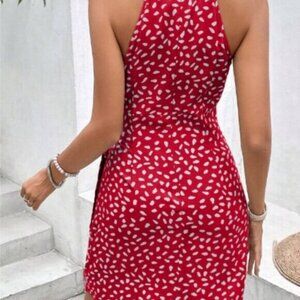 Sleeveless polka dot pleated dress with waist halter neck