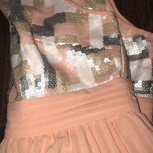 Blush dress with pleats. V necked, tie and zipper closure. Sequin is blush gray and white.Brand new with tags on size large. Purchased From ModCloth. Great for a formal event, date night, tea party or to rock the runway. Super feminine and cute. Purchased from ModCloth.