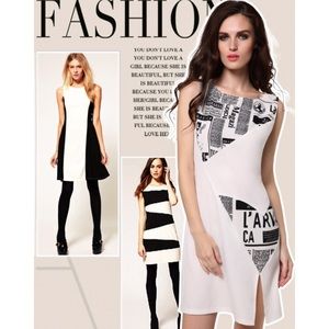 THE dress U will want to wear anywhere! On the town, office, events, shopping, travel. U name it! Sexy slit in front. White w/black graphic. Polyester. Lightweight and sheer in some areas. Back Zipper w/one button creating keyhole affect. Hand, machine wash or dry clean. Please read measurements below for your fit!
