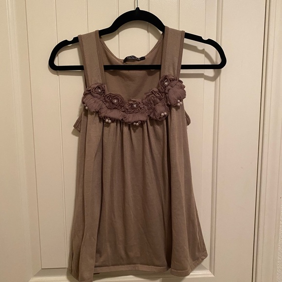 Sleeveless top with floral and beaded detail along the neckline, cotton material