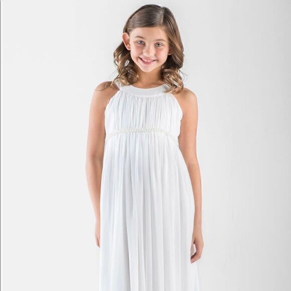 Back zip closure, grecian inspired silhouette, collar neckline, braided trim traces the empire waist to create a flattering fit.