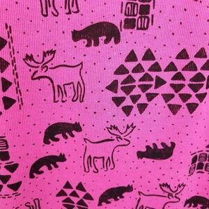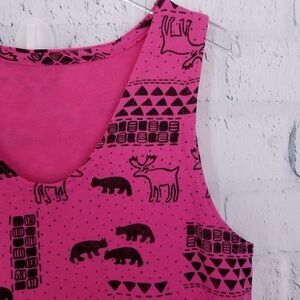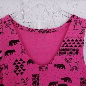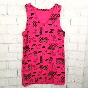 This dress has no size or fabric tag. The fabric print was just too cute. It is brigh pink and black with an outdoors print of moose and bear A cute dress or a swimsuit cover up. Great for those trips to the mountain areas. Approximate measurements are pit to pit 19". Length 33".