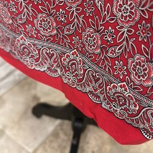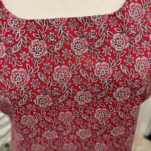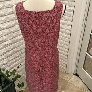 This is a stunner! The color of this sleeveless dress is a deep red with gray flowers throughout. Zipper back, fully lined, 100% cotton (both dress and lining). Feels like satin. Notice the sweet design at the hemline. You will feel and look like a million bucks in this gorgeous dress…perfect for an afternoon affair or a simple lunch date with friends. One of my favorites…machine washable, never put into the dryer.