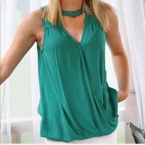 Sleeveless Surplice Top. Features a choker style neckline and elastic at front hemline creates a gathered look.
