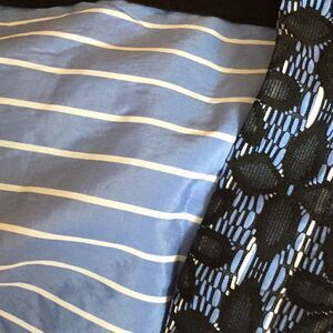 Black lace with flowers over powder blue & white pinstripe lining.
