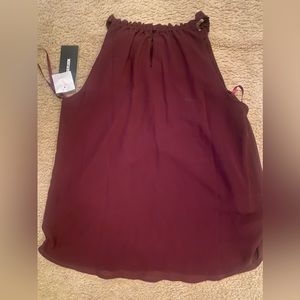 Sleeveless wine color blouse.