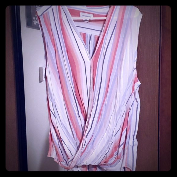 Multicolored sleevless blouse, buttons in the middle and flows in the front.