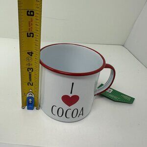 Sleigh Bell Bistro I Love Cocoa Metal Mug Red Rim White Enamel Cup 20 oz Holiday