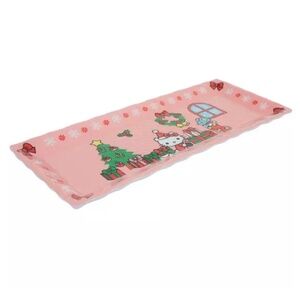Put the finishing touches on your themed tablescape with this Santa Hello Kitty Tray. This pink tray features Hello Kitty wearing an adorable Santa outfit while surrounded by presents and Christmas decorations. The edge has a slightly dimpled design and is decorated with bows, snowflakes, and flowers. Serve delicious finger foods and baked goods on this tray for guests to enjoy.