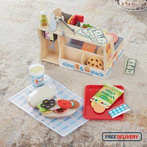 Create piled-high sandwiches, made to order with this wooden sandwich counter play set with all the fixin’s! The sturdy wooden deli counter includes a play meat and cheese slicer for the wooden play food, and felt sandwich roll and toppings to create sandwiches ordered from the menu. There is a wooden dressing bottle, play snacks, and a cup with drink insert to round out meals that customers can pay for with the included play money! An illustrated guide helps with sandwich prep and shows kids how to use the slicer. All 52 pieces store in the sandwich counter for easy cleanup. It’s a deliciously fun way to encourage counting, sorting, and fine motor skills, as well as imaginative play and storytelling. This product is certified by the Forest Stewardship Council. FSC certification ensures that products come from responsibly managed forests that provide environmental, social, and economic benefits, and that forests are protected for future generations.