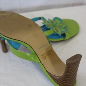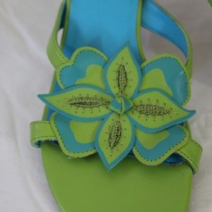 Lime green/turquoise slip on heels. Embroidered flower detail on top of foot. Worn only a few times. Excellent slightly used condition with no notable problems. Smoke free home.