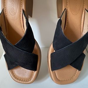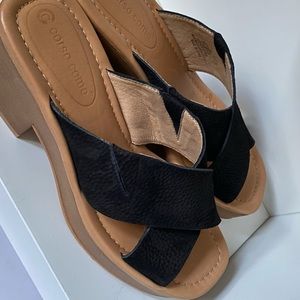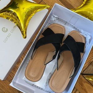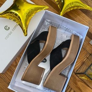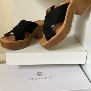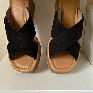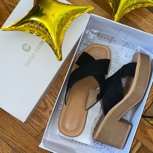 A thick platform and heel lift your steps in this crisscross slide sandal with a padded footbed and elastic insets for all-day comfort.