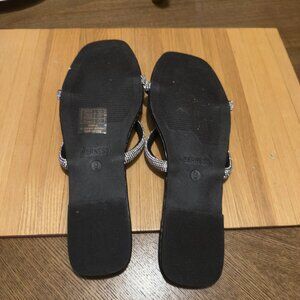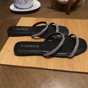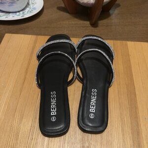 Description Add a little sparkle to sunny days. These BERNESS slide sandals feature two crystal‑embellished straps on a sleek black footbed—easy, chic, and perfect for a day at the pool or beach. Slip them on with your swimsuit and cover‑up or a breezy maxi dress for instant vacay vibes.
