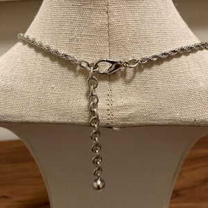 About 20 in long having a 3 inch drop. Lobster claw clasp closure. The slide works to lengthen or shorten the drop.