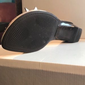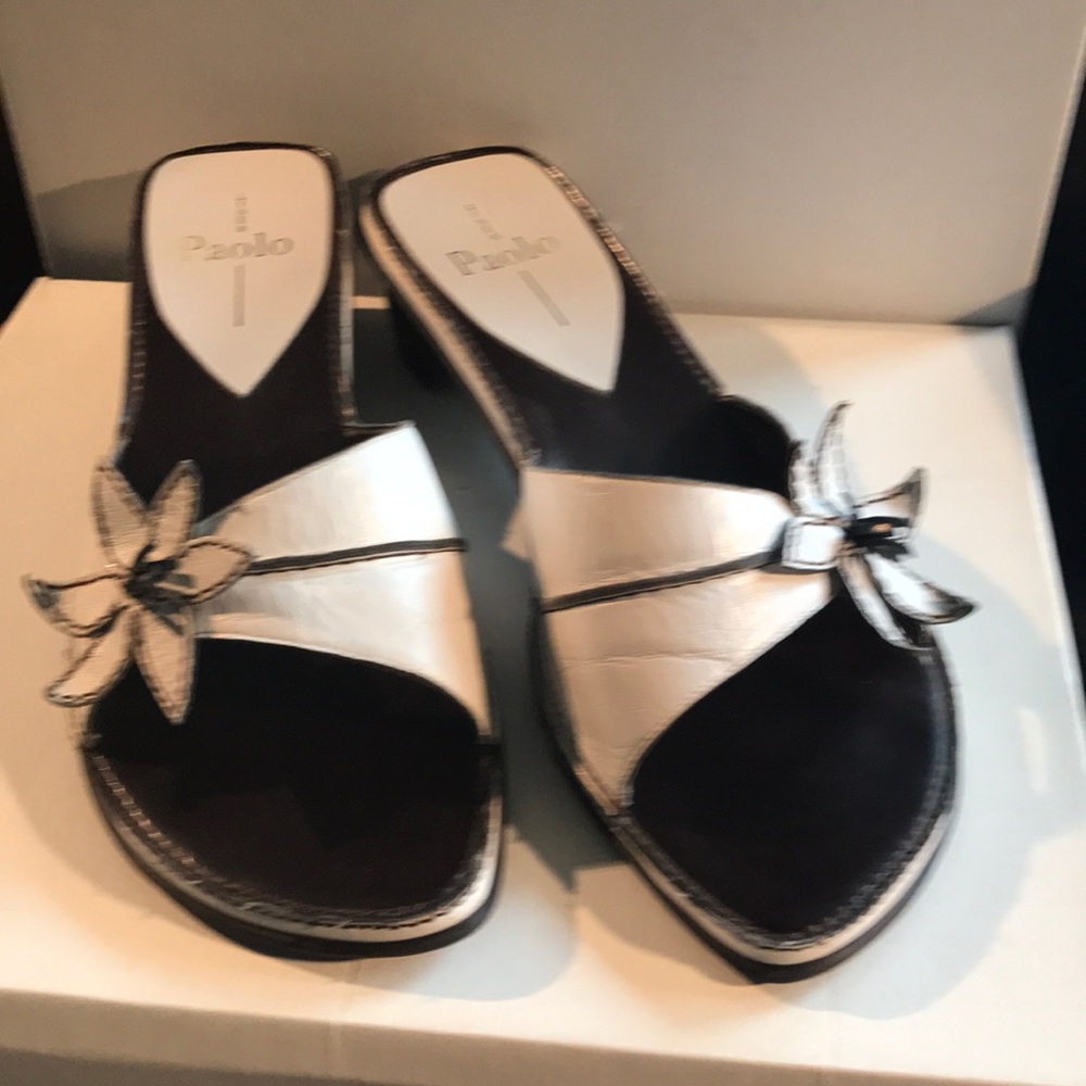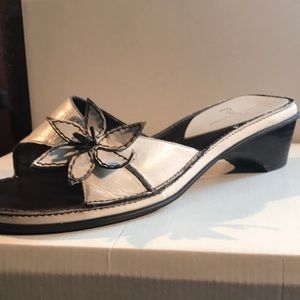 Low heeled (1.5”) white leather slides with daisy detail. Used