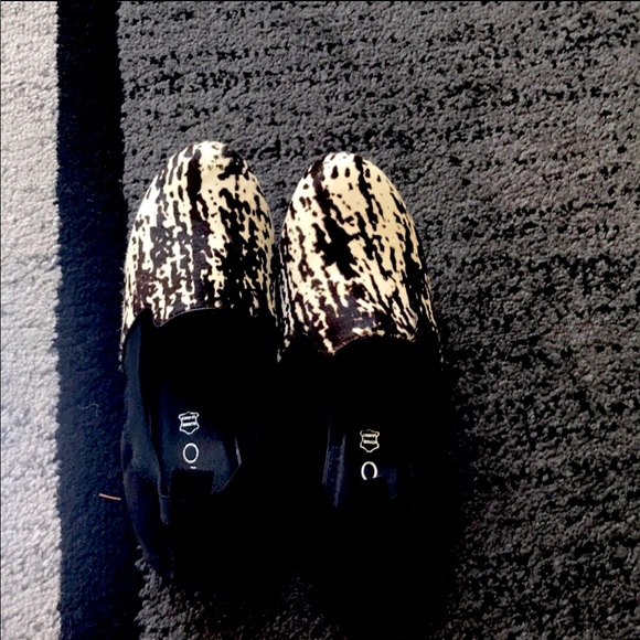 Black with white and black fuzzy slides