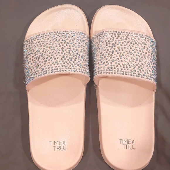Slides by the brand time and true in a size 7-8 I think I only really wore them around the house and it wasn't very often they stayed in my closet for a long time so they need a new home they are pick with sparkly sequence all over them