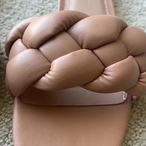 BCBGeneration tan slides. Comfortable, trendy with gold hardware on the heel. Worn once. Puffy braided strap