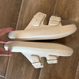Birkenstock style slides. Birkenstock isn’t the brand of these, just looks like them