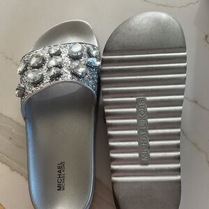 Silver embellished slides; moderately worn